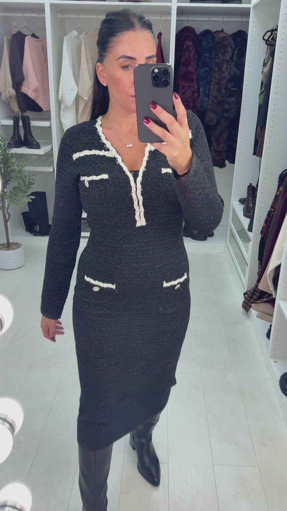 This Verona maxi dress sparkles with playful charm, featuring a soft stretch lurex fabric that moves with you. The elegant V-neck and long sleeves set a graceful tone, while the embellished woven hem and pockets with button details add a delightful twist. Perfect for making an entrance with effortless style and a touch of shimmer.