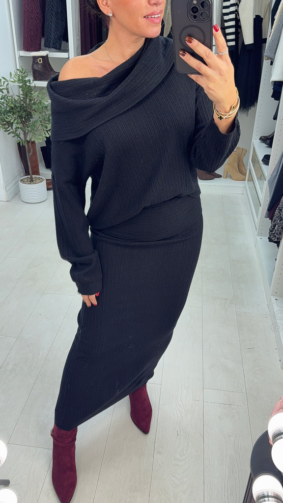 Mylene Black Ribbed Bardot & Skirt Co-Ord