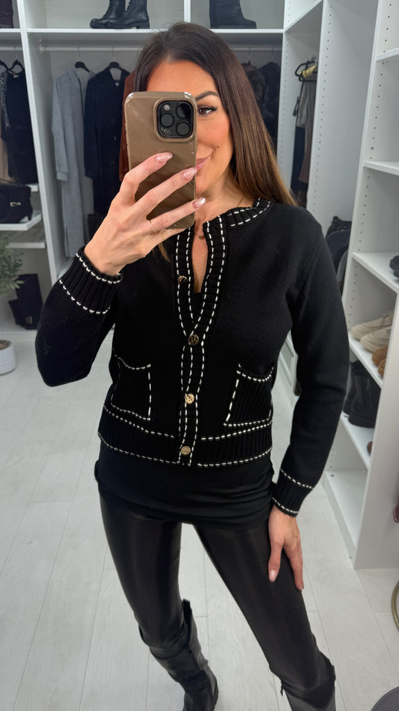 Playfully chic, the Lessie Plain Detailed Trim Button Front Cardigan is your new go-to layer. Featuring a round neck and a button front closure, it adds effortless style to any outfit. Long sleeves with ribbed cuffs keep things cozy while pockets offer practical charm. Perfect for days when you want comfort with a touch of personality.