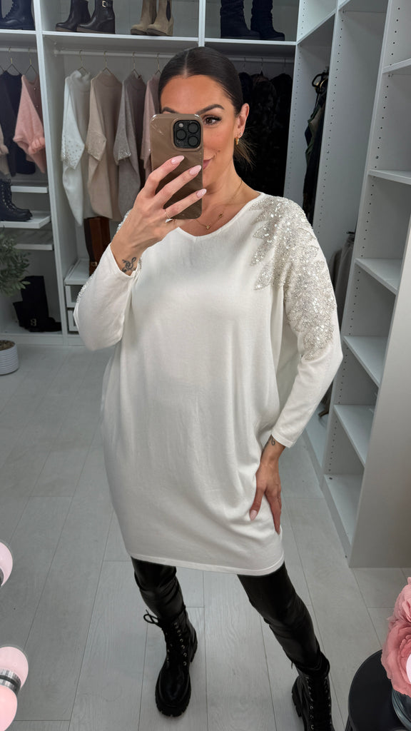 Wrap yourself in cozy charm with the Mireya Embellished Shoulder Longline Jumper. Featuring a flattering V-neck and a relaxed, loose fit, it’s perfect for layering or wearing solo. The sparkling embellished shoulders add a cheeky touch of sparkle to your everyday look, making comfort feel a little more fabulous. Whether you're lounging or out and about, this jumper effortlessly blends laid-back style with a hint of playful glamour.