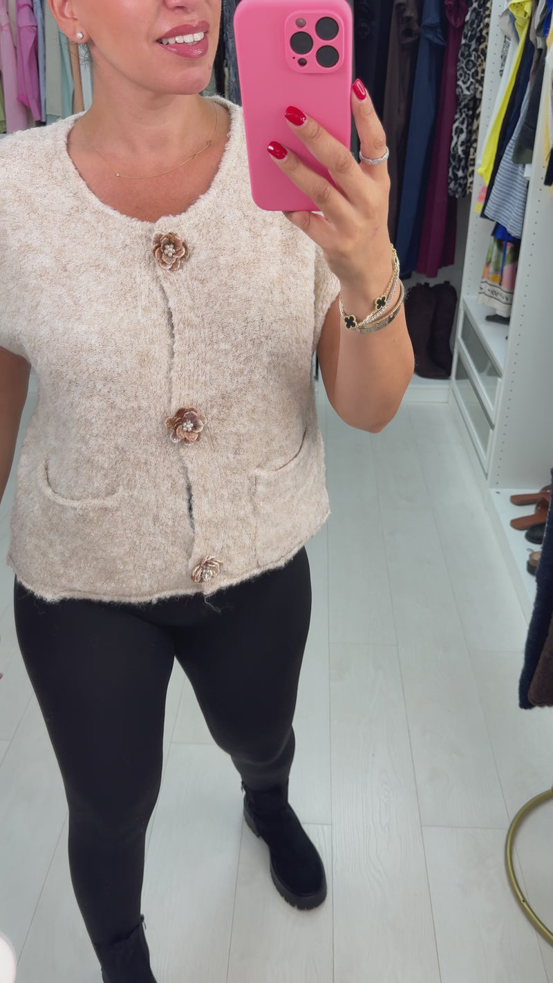 Lorella Plain Floral Button Detail Sleeveless Knit Cardigan