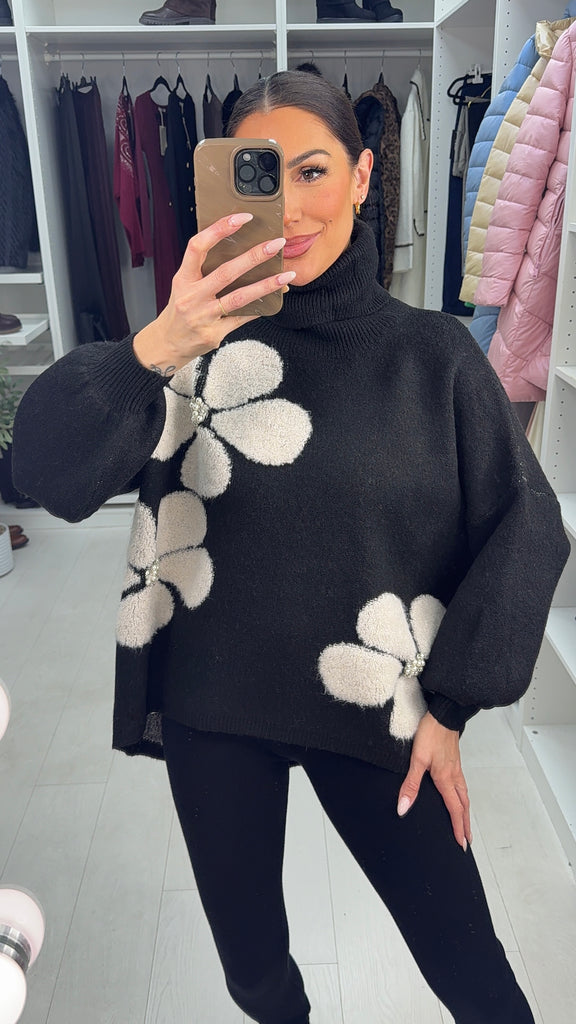 Clare Embellished Floral Detail Oversized Roll Neck Jumper