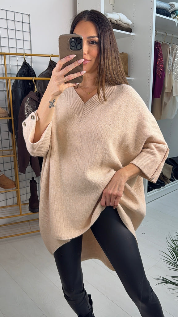 Experience ultimate comfort with the Lauretta Super Soft Button Detail Longline Jumper. Crafted from luxuriously soft fabric, it features a flattering ribbed V-neck and stylish button details on the 3/4 sleeves. The longline fit with a dipped hem adds a modern touch, making it perfect for layering or wearing on its own. Elevate your wardrobe with this versatile and cozy jumper designed to keep you comfortable and chic all day long.