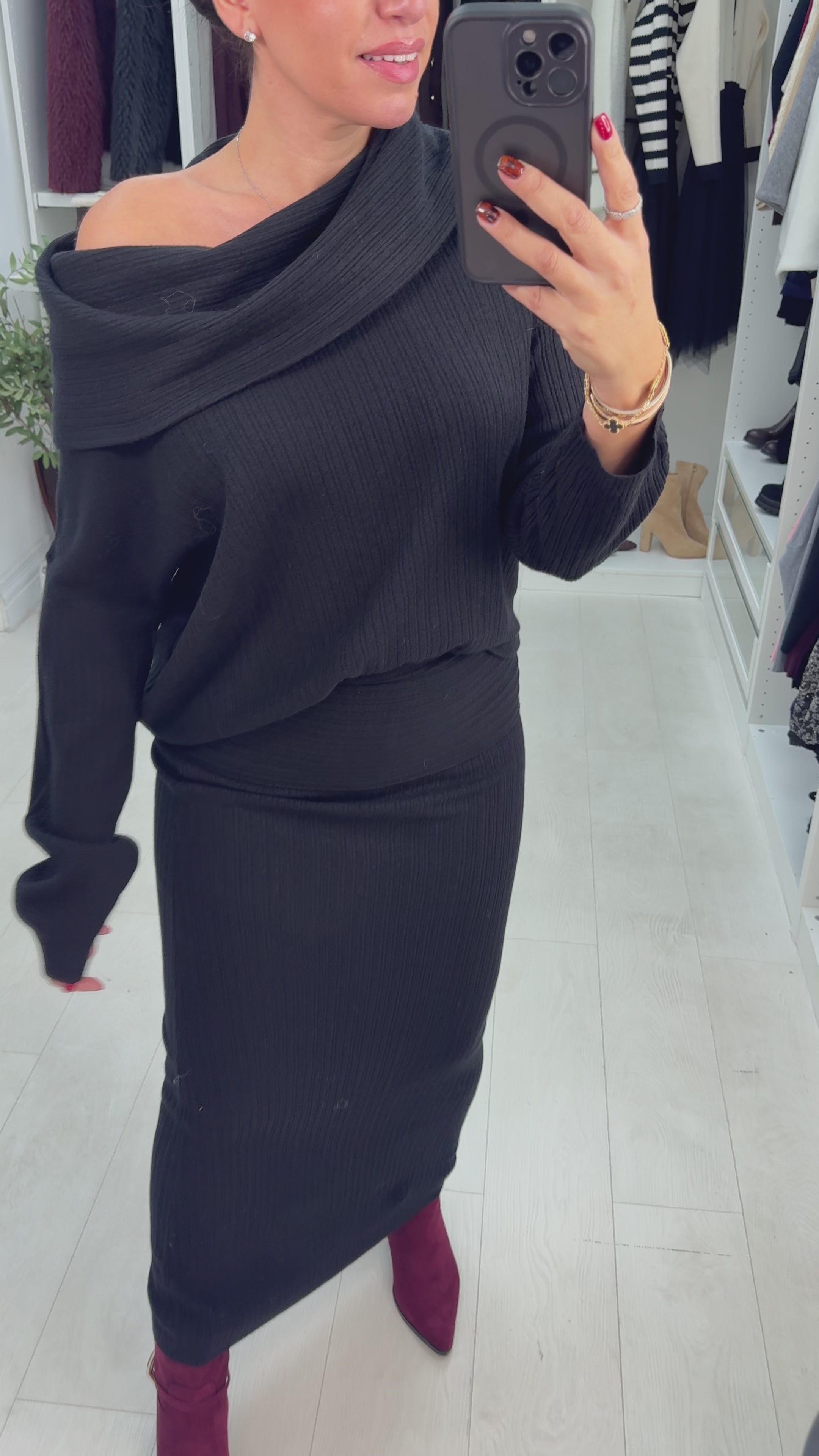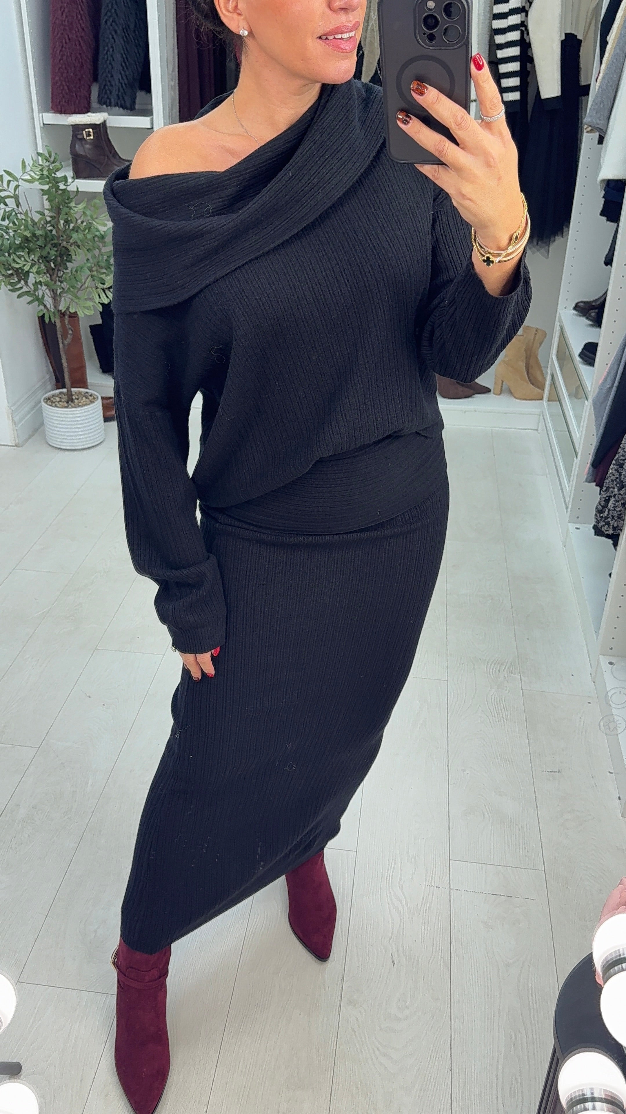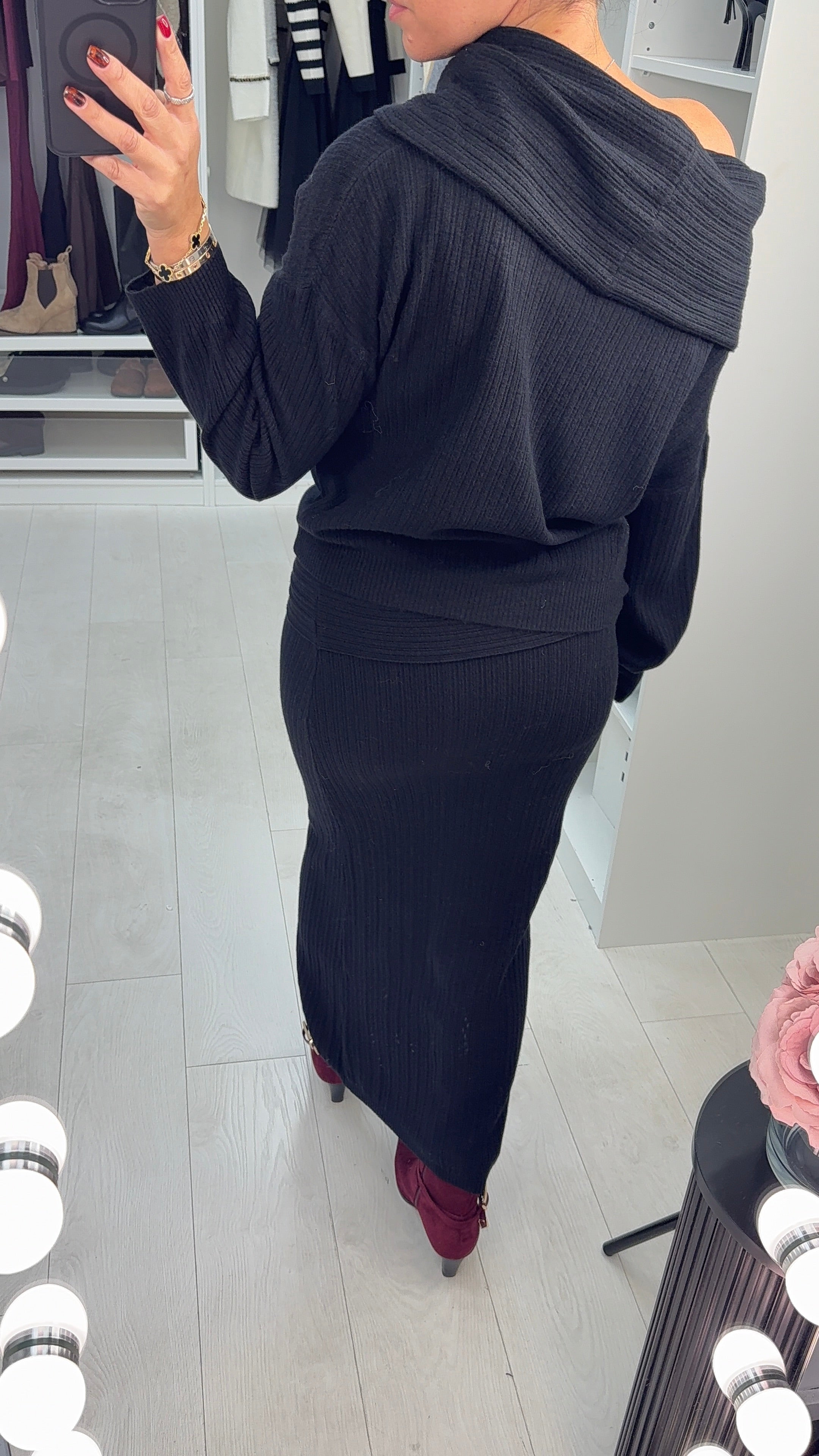 Effortless elegance meets versatile styling with this stunning co-ord set. The ribbed top transitions seamlessly from off-the-shoulder bardot to cosy cowl neck, giving you two looks in one piece, while long sleeves provide year-round wearability. The maxi skirt features a luxurious soft stretch fabric and flattering fold-over waistband detail for a refined silhouette. Perfect for creating polished outfits that work from day to evening, this set delivers timeless appeal without compromising on comfort or style.