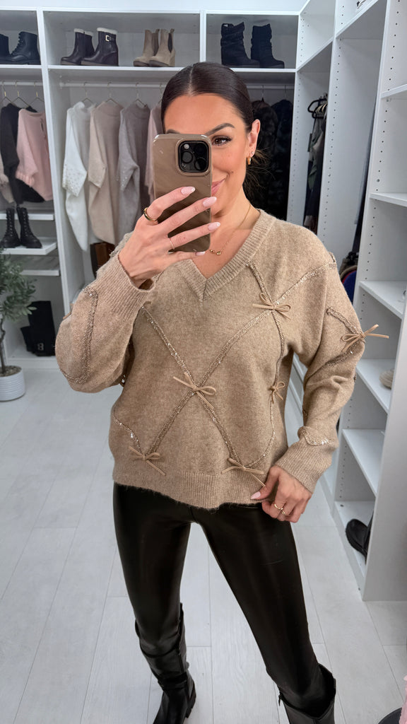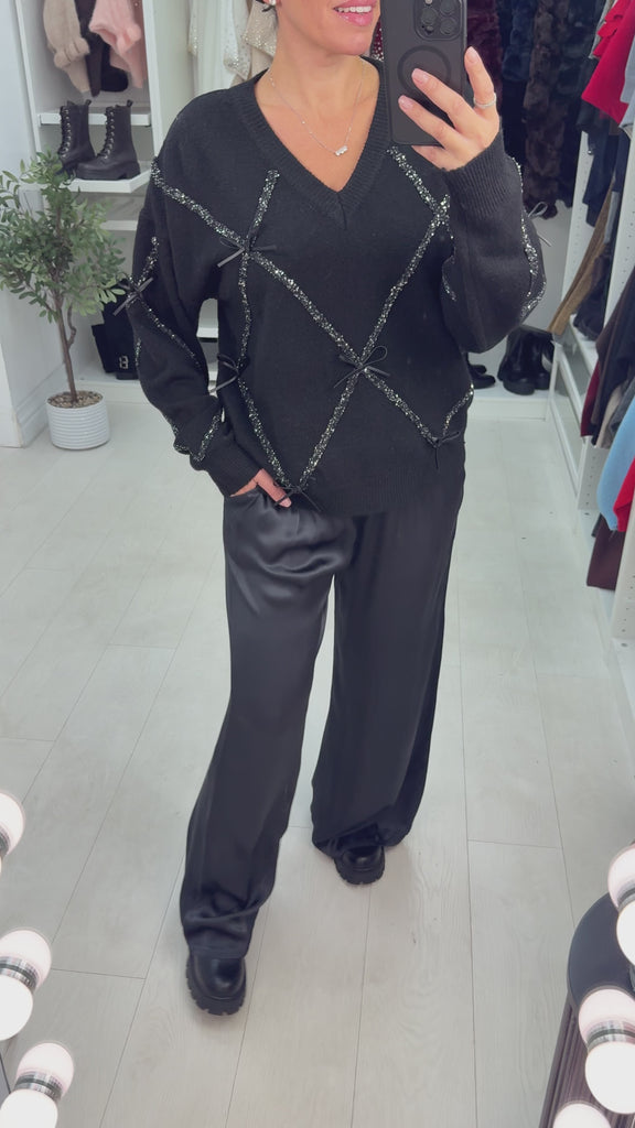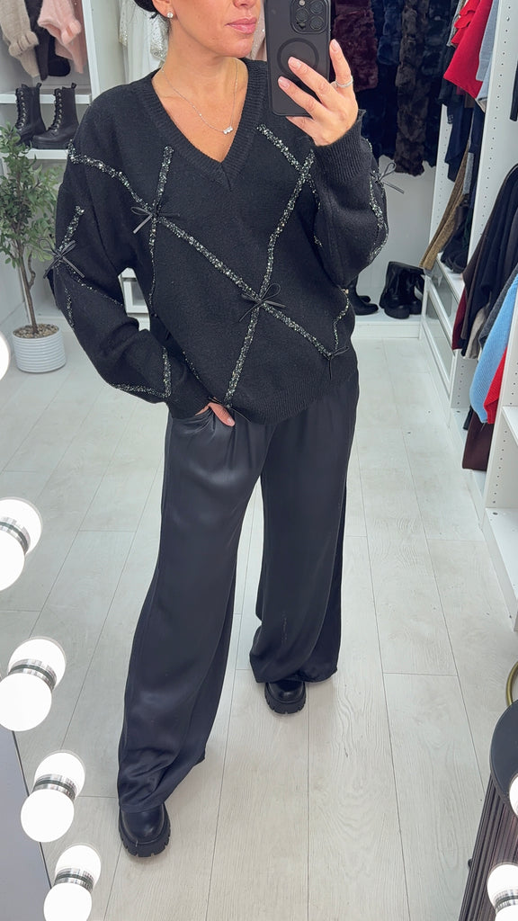 The Norie Bow Embellished V Neck Jumper combines elegance and comfort with its delicate bow and sequin embellishments. Crafted from super soft fabric, it offers a cozy feel against the skin. The flattering V neck and long sleeves with ribbed cuffs create a refined silhouette, making it an ideal choice for stylish, everyday wear. Add a touch of sparkle to your outfit with this versatile jumper.