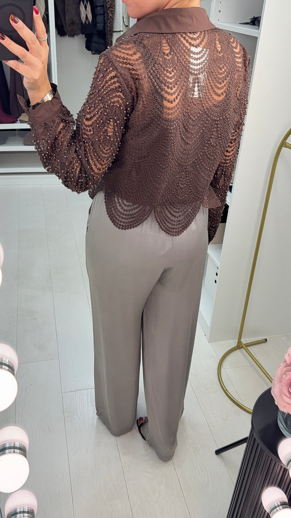 Elevate your wardrobe with the Noemi Top, a stunning piece that seamlessly blends elegance with practicality. Adorned with delicate floral and pearl embellishments, this sheer button-front shirt features a charming scalloped hem and collar that add refined detail. The included strappy cami top with a classic round neckline provides perfect layering coverage, allowing you to style this piece with confidence whether worn together or separately. Ideal for occasions calling for understated sophistication, the Noemi offers versatile styling options that transition effortlessly from day to evening wear.