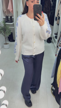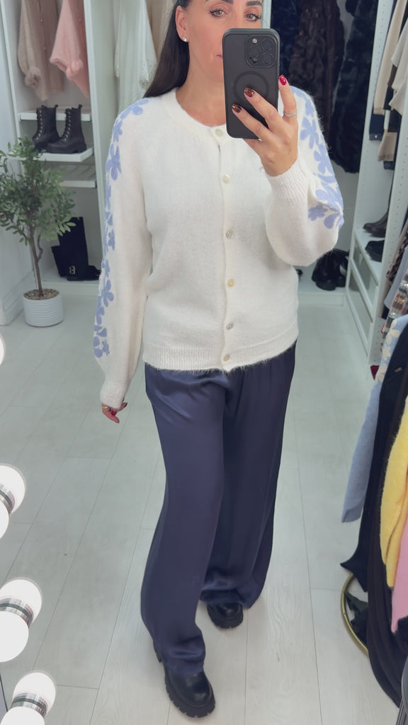 Wrap yourself in effortless elegance with the Camila Cardigan. Crafted from luxuriously soft fabric, this wardrobe essential features charming floral detailing along the sleeves that adds a touch of botanical beauty to any outfit. The classic round neckline and smooth button closure make it perfect for layering over dresses, tees, or worn solo. Versatile enough for casual days or dressed-up occasions, this cardigan delivers comfort without compromising on style.
