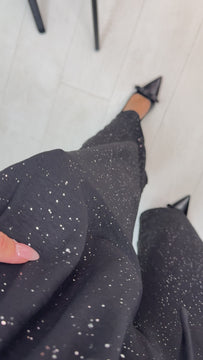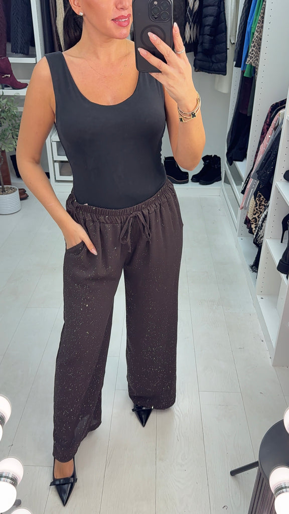 Elevate your party season wardrobe with the Freyanna Trousers. Featuring a flattering wide-leg silhouette and comfortable elasticated waist, these statement trousers deliver effortless style and all-day comfort. The eye-catching glitter effect catches the light beautifully, while a charming bow detail adds a touch of sophistication. Practical pockets keep your essentials close. Perfect for celebrations and special occasions, these trousers are your go-to piece for standing out in style.