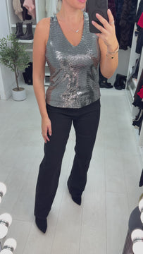 Shine bright at every event with the Ivanna Sequin V Neck Cami Top. Covered in dazzling sequins, this top catches the light beautifully, while the flattering V-neck adds a touch of elegance. Its sleek cami style ensures a comfortable yet stylish fit, making it the perfect choice for special occasions where you want to stand out effortlessly.