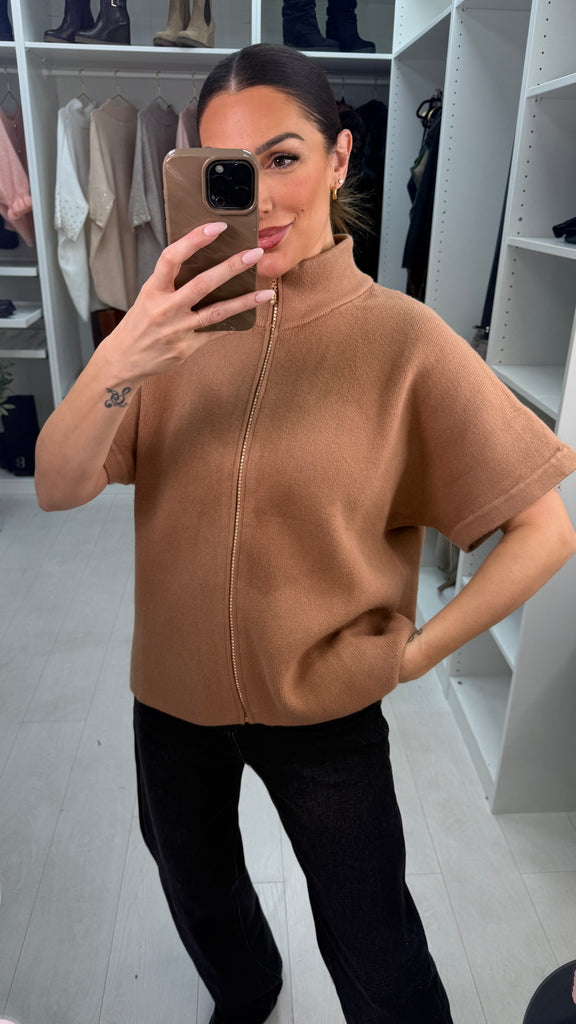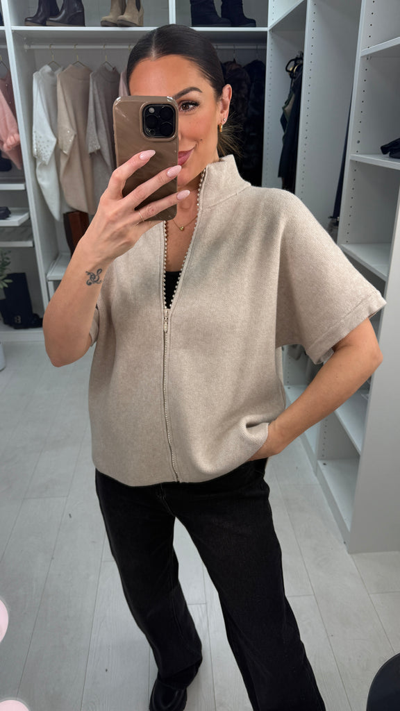 Wrap yourself in cozy charm with the Jemma High Neck Cardigan. This super soft, short-sleeve beauty features a playful diamante zip that adds just the right amount of sparkle. Zip it up to show off the high neck or leave it loose for effortless style—comfort never looked so fun!
