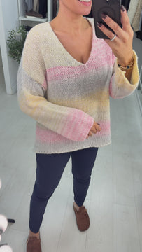 Kathie Ombre Dipped Hem Knit Jumper Sink into effortless comfort with this beautifully crafted knit jumper, featuring a mesmerising ombre gradient that flows seamlessly across soft, touchable fabric. The relaxed soft V-neck frames the face with understated elegance, whilst the signature dipped hem adds contemporary movement and visual interest. Long sleeves provide warmth without bulk, making this the perfect layering piece for transitional seasons. Designed for those who refuse to compromise between style and cosiness, this jumper wraps you in softness that feels as good as it looks.