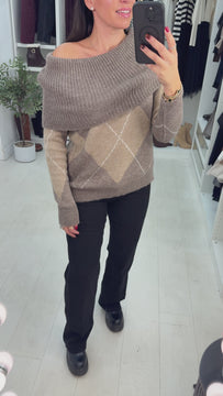 Elevate your knitwear collection with the Nelly Argyle Print Bardot Jumper—a versatile piece that effortlessly transitions between styles. Featuring a chic bardot neckline that doubles as a flattering cowl neck, this jumper offers two looks in one. The soft stretch fabric drapes beautifully while maintaining its shape, perfect for all-day comfort. Long sleeves finished with ribbed cuffs provide a polished touch, while the loose fit ensures relaxed elegance. The timeless argyle print adds contemporary flair to your wardrobe, making this jumper an essential investment for modern, on-trend styling.