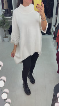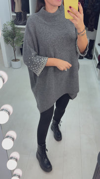Embrace cozy comfort with the Priscella Jumper, featuring a loose, oversized fit and a stylish dipped hem for effortless charm. Sparkle subtly with diamante-embellished sleeves that catch the light just right, while the soft fabric and high round neck keep you snug all day. Perfect for days when you want to relax but still stand out with a playful twist.