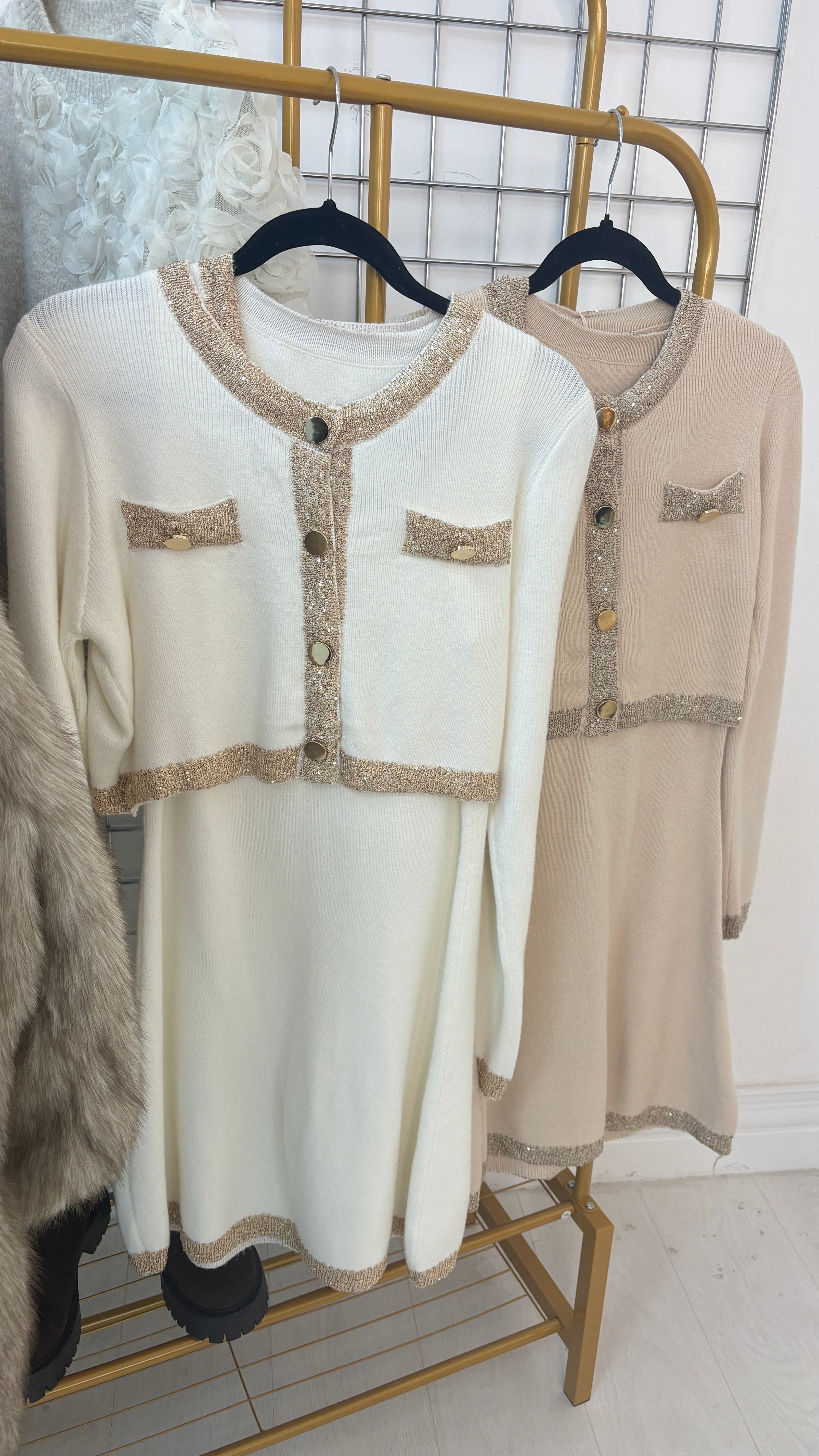 Get ready to shine with the Sonia Ribbed Sequin Hem Detail 2 Piece Dress Co-Ord Set! This playful duo includes a stretchy, ribbed knitted dress and a button-closure cardigan, both featuring sparkling sequin accents along the hem for a touch of glam. Perfect for mixing comfort with style, this set moves with you while turning heads wherever you go.