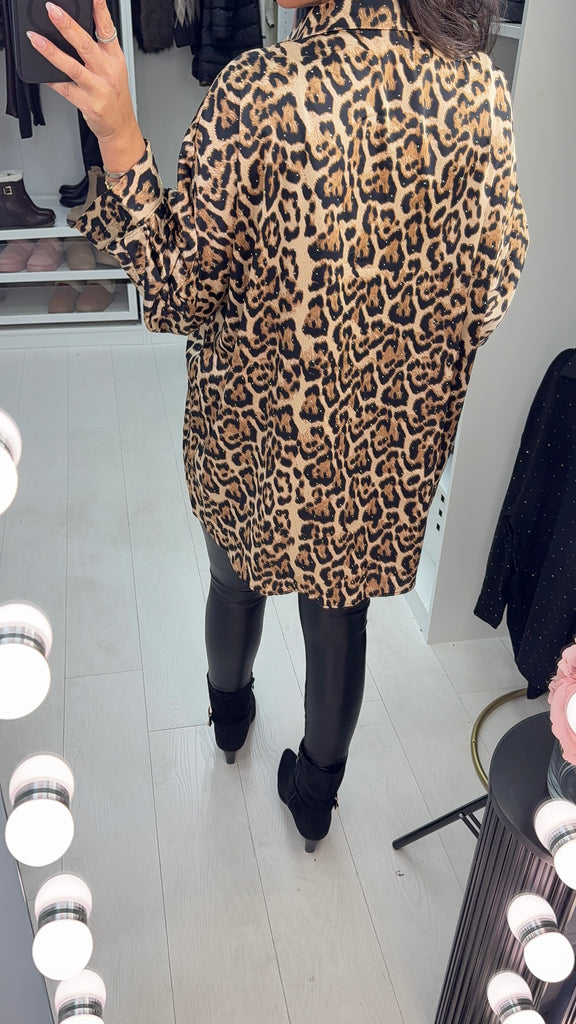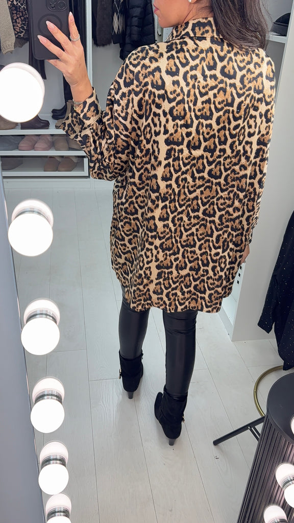 Embrace wild sophistication with the Campbell Leopard Print Diamante Embellished Shirt. This statement piece combines classic leopard print with eye-catching diamante detailing for effortless glamour. The relaxed loose fit ensures all-day comfort, while the structured collar and button closure deliver polished versatility. Perfect for dressing up casual looks or adding edge to your everyday wardrobe.