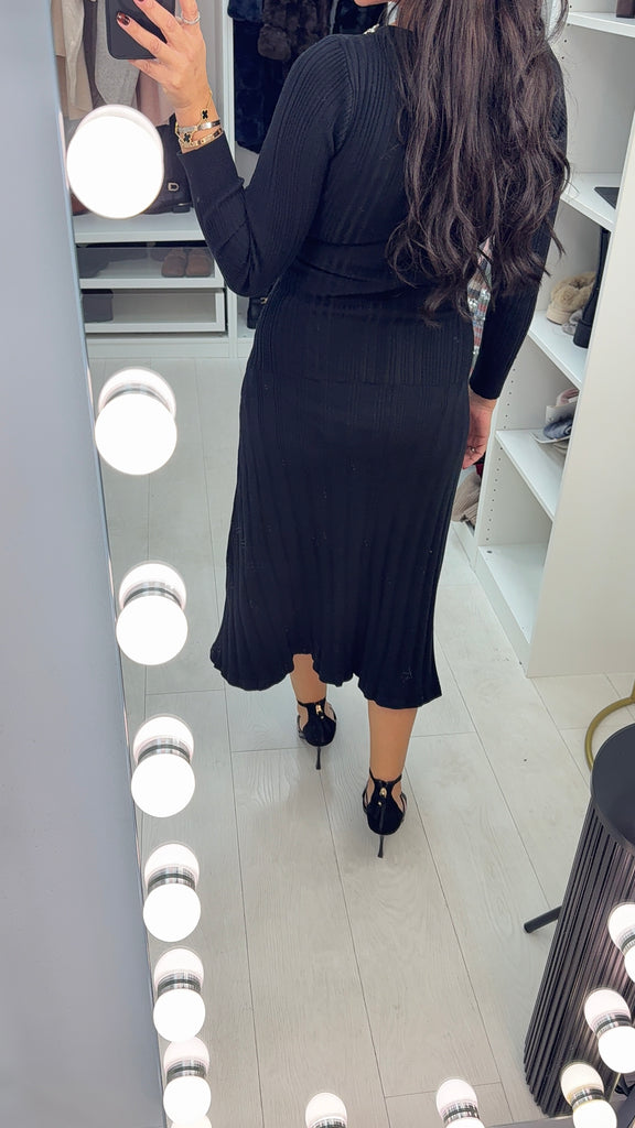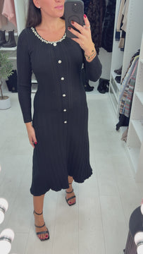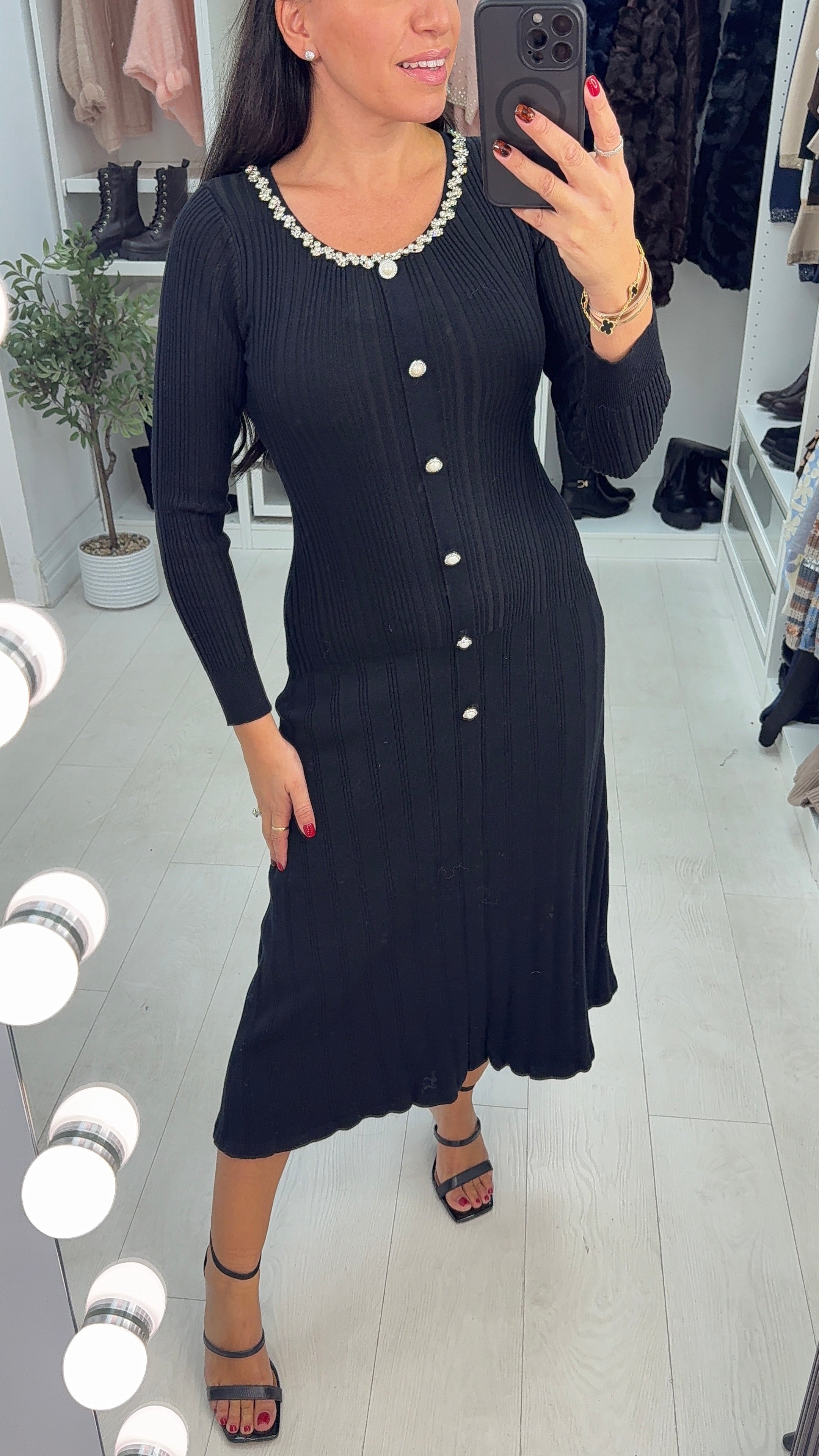 Slip into the Astella Embellished Neckline Ribbed Midi Dress and let the fun begin! This black midi dress hugs your curves with its stretchy ribbed fabric, while the embellished round neckline adds just the right amount of sparkle. Long sleeves and chic pearl button details bring a touch of elegance, making it perfect for day or night adventures. Get ready to twirl, sparkle, and turn heads wherever you go!