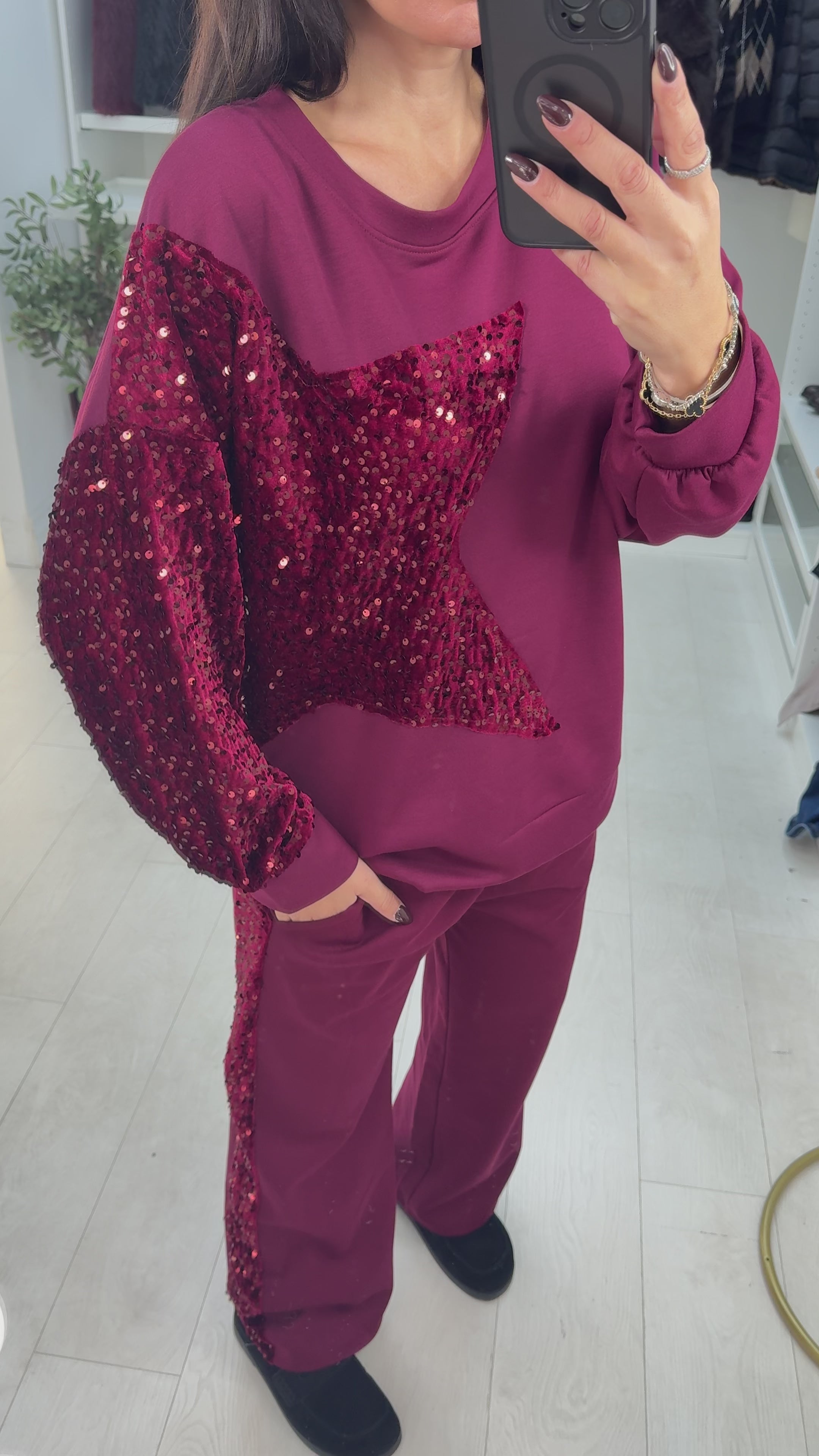 Elevate your loungewear game with the Laurina Sequin Star Detailed Set. This eye-catching ensemble features a cosy round-neck jumper adorned with shimmering sequin star details, paired with relaxed wide-leg trousers that deliver both comfort and style. The trousers boast an elasticated waist for effortless fit, functional pockets for practicality, and a striking sequin side panel that catches the light beautifully. Perfect for those who refuse to compromise on glamour, even when relaxing at home.