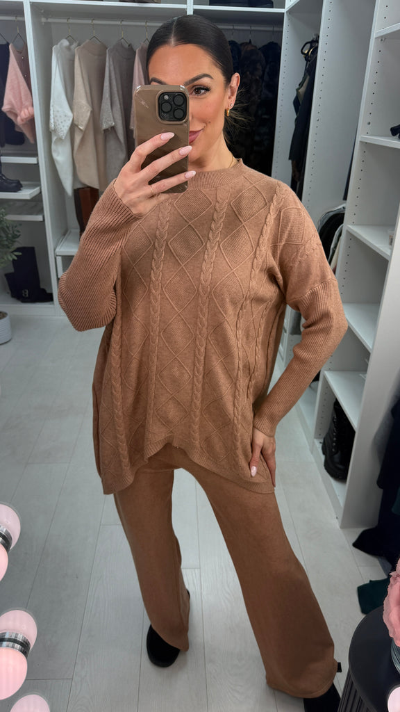 Experience comfort and style with the Elisha Plain Cable Knit Loungewear Set. The loose-fitting top features a delicate cable knit detail, long sleeves with fitted ribbed cuffs, a round ribbed neckline, and a flattering high-low hem. Paired with wide-leg trousers that offer an elasticated waist for an effortless fit, this set provides the perfect blend of relaxed elegance and cozy wearability for lounging or casual outings.