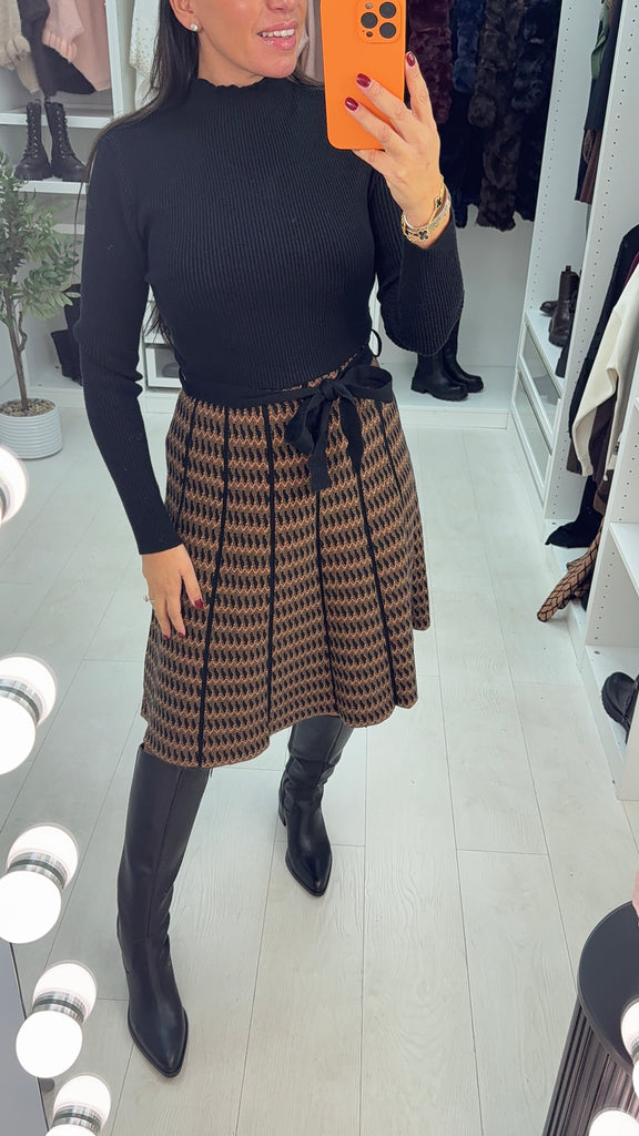 This Sassia Printed Skater Midi Dress brings fun flair to your wardrobe with its playful print and flattering skater silhouette. The ribbed top half features a cozy long sleeve and a classic round neck, making it perfect for layering or wearing solo. Practical pockets add a cheeky touch, while the tie belt waist lets you show off your shape with ease. Effortlessly cute and comfy, this jumper dress is ready to twirl through your day!