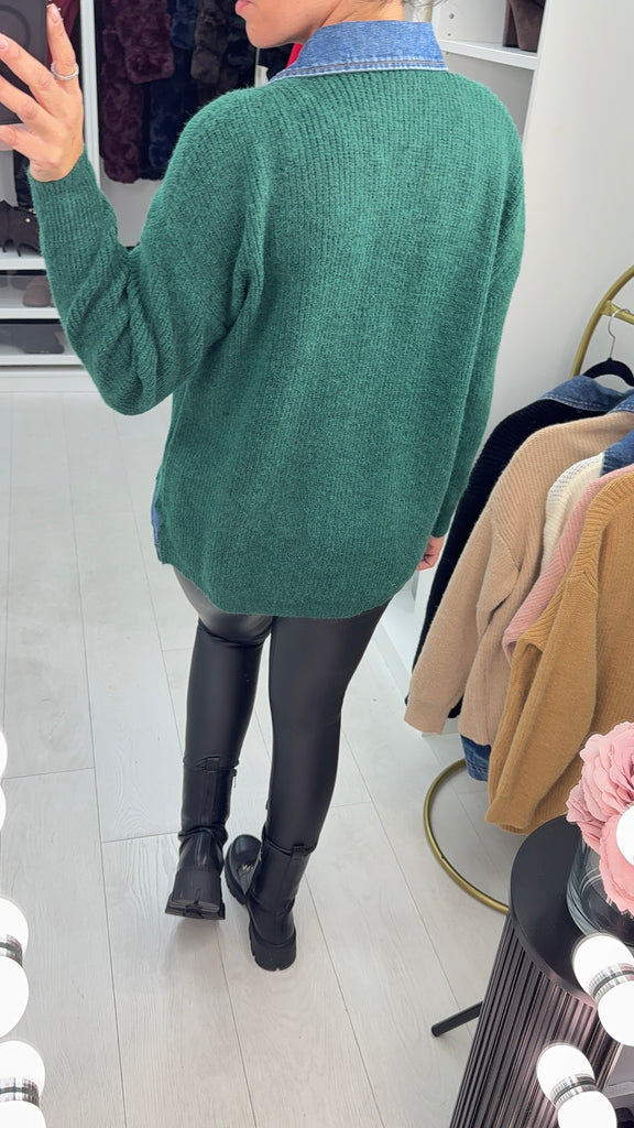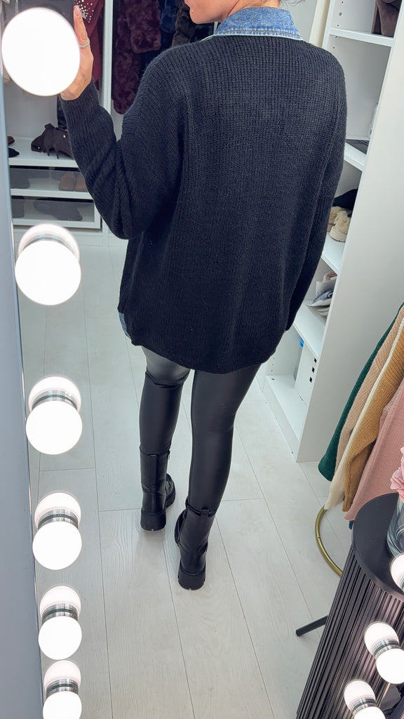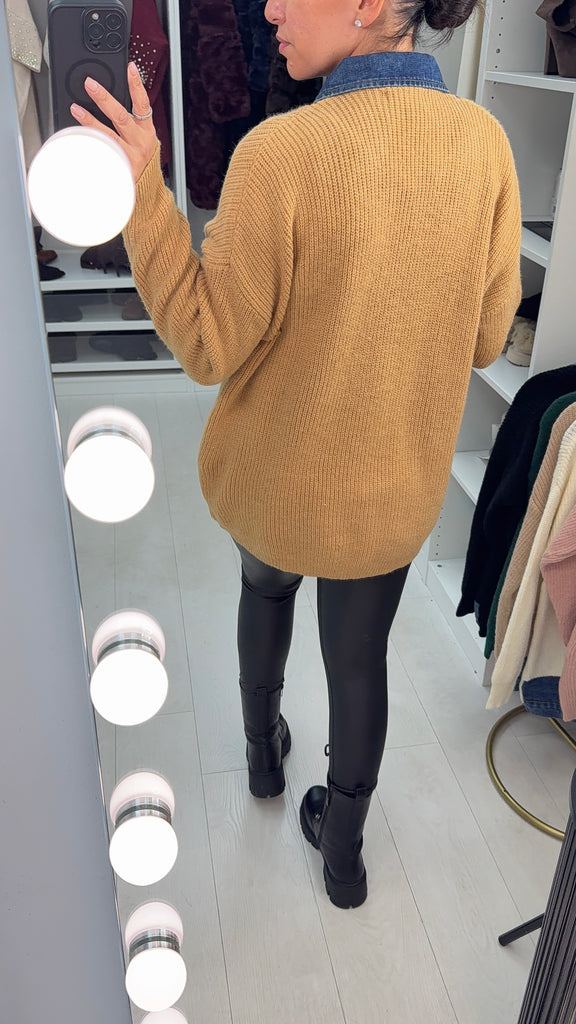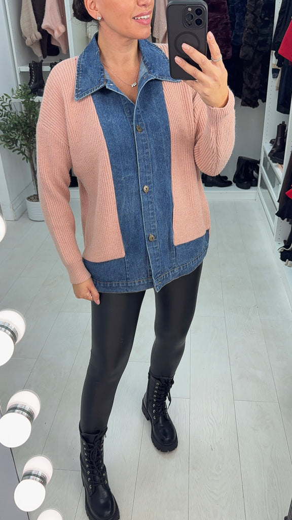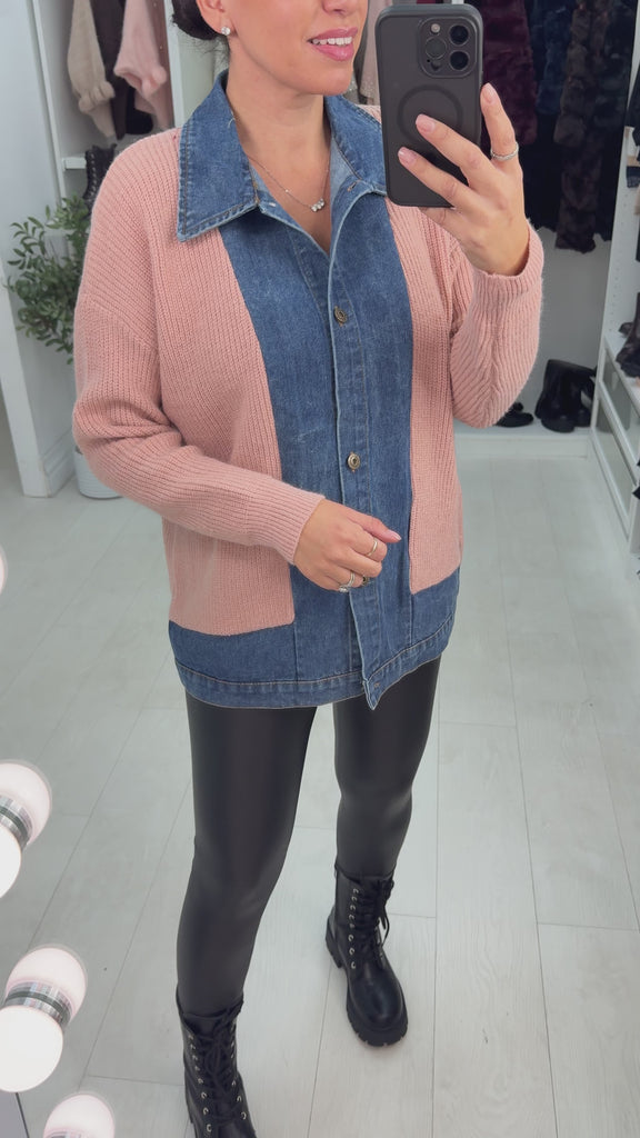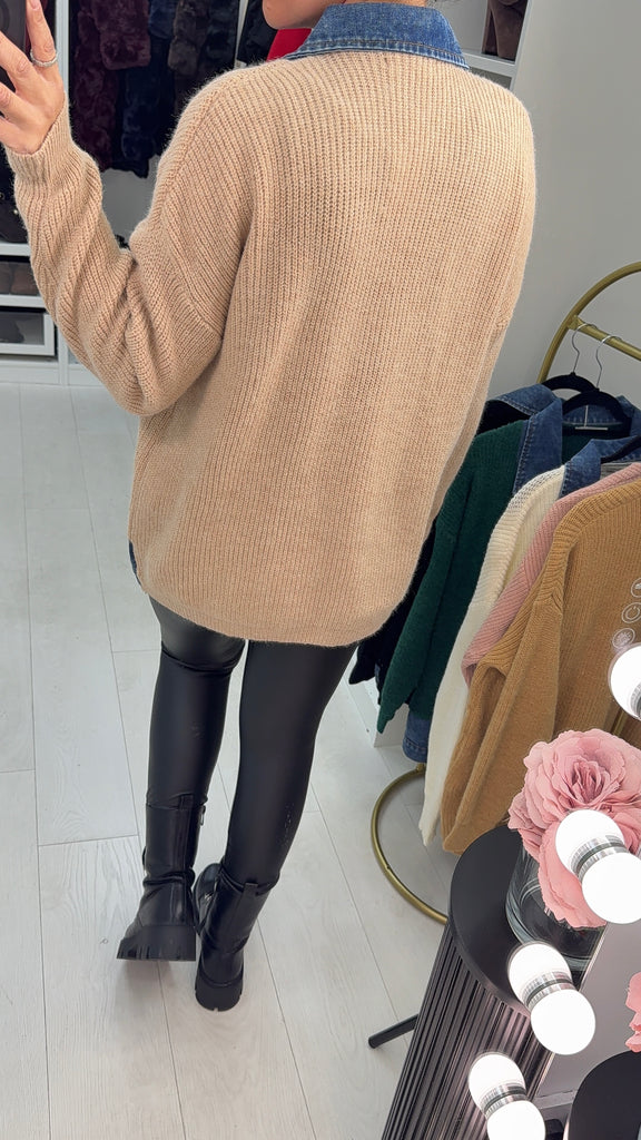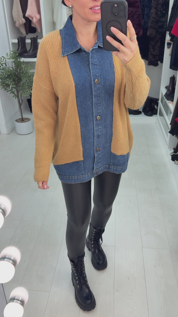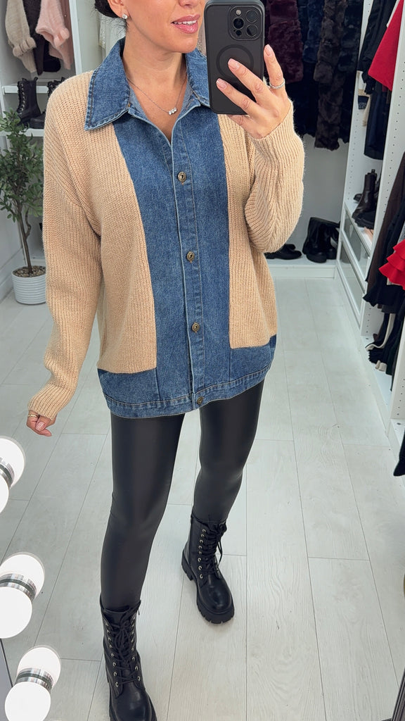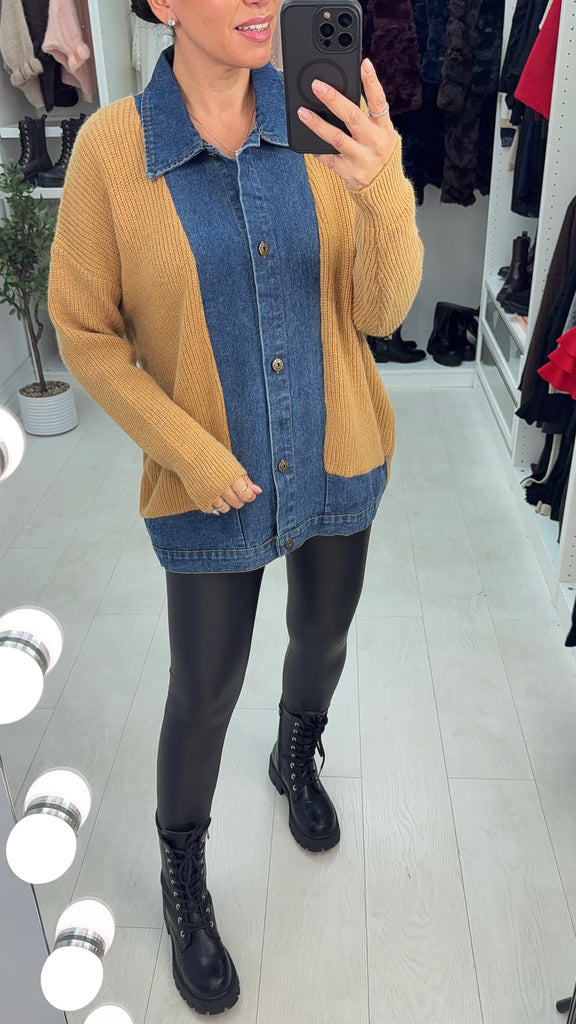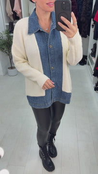 Elevate your everyday wardrobe with the Kimber jumper, a sophisticated layering piece that seamlessly blends classic knitwear with contemporary edge. Featuring a flattering longline silhouette and soft knitted sleeves, this cardigan is finished with striking denim detailing at the collar and hem for a modern twist. The functional button closure allows effortless styling versatility, making it perfect for dressing up or down. Whether you're layering over a dress or pairing with your favourite jeans, this piece delivers both comfort and undeniable style.