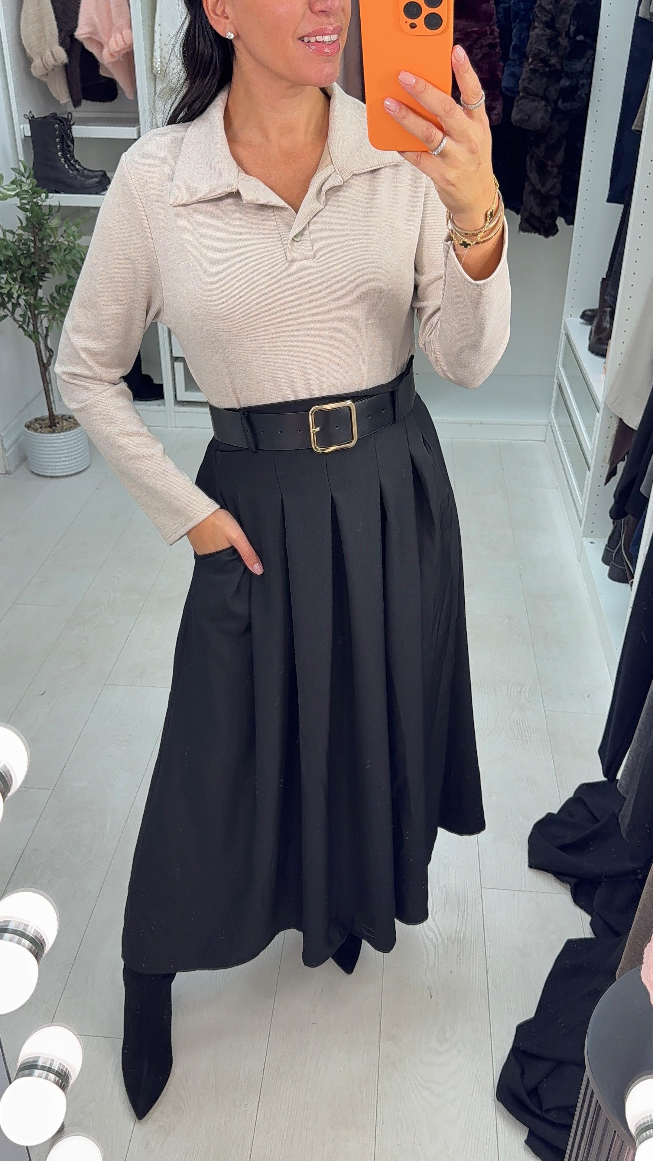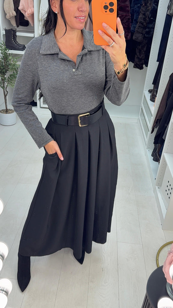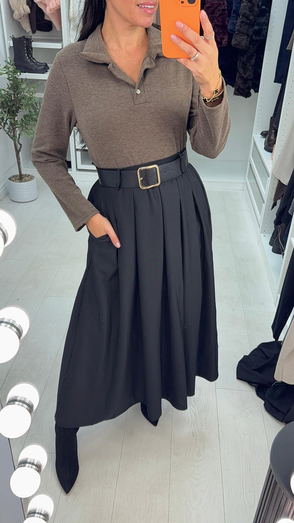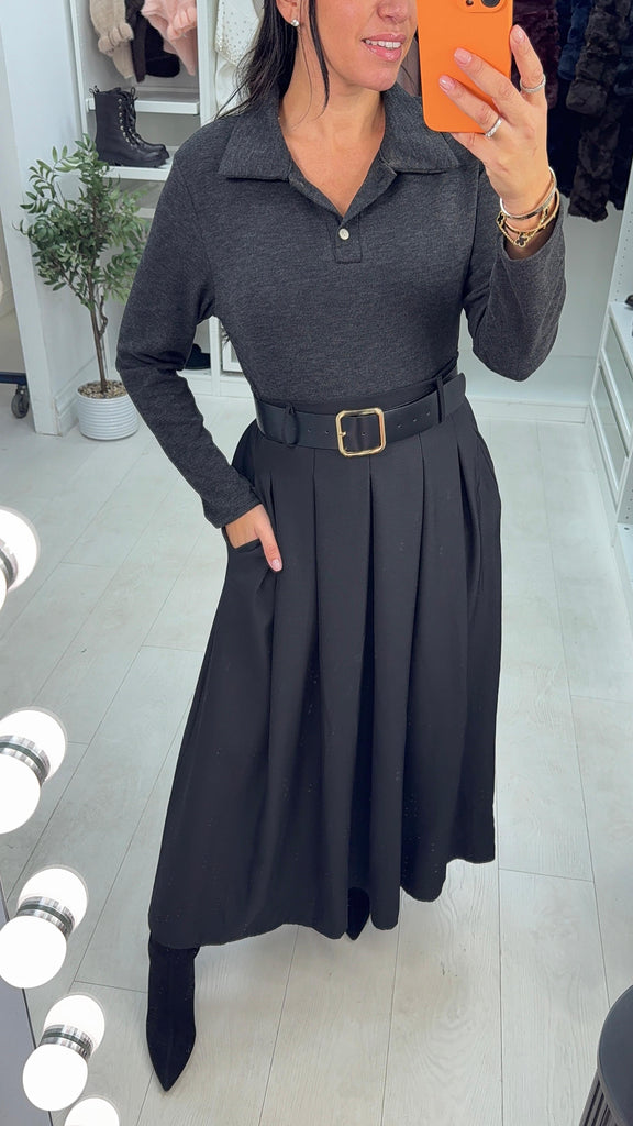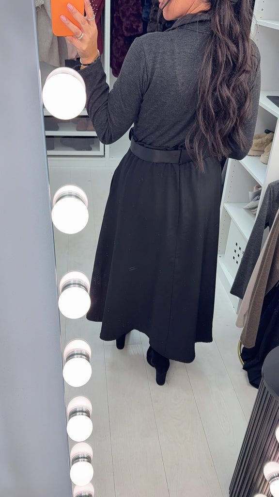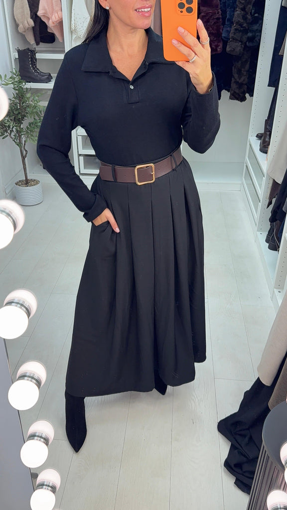 Elevate your wardrobe with the Milly V Neck Belted Black Skirt Dress. Featuring a flattering V-neckline, elegant collar, and delicate button details, this long-sleeve dress combines sophistication with style. Its black skirt adds a timeless touch, while the included belt cinches the waist for a polished silhouette. Perfect for any formal occasion, this dress ensures you look effortlessly chic and confident.