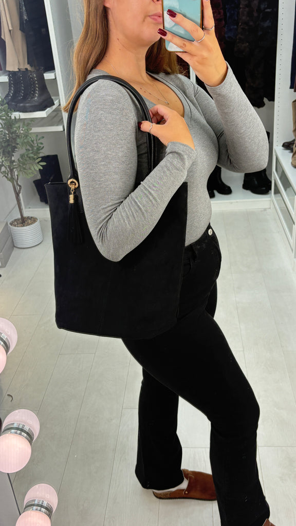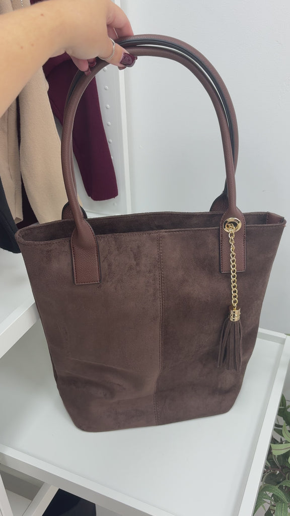 Add a touch of playful charm to your look with the Ottie Faux Suede & Tassel Detail Bag. Crafted with a soft faux suede body and a sleek faux leather strap, this shoulder bag features a fun tassel detail and secure zip closure. Inside, find handy pockets plus a smaller bag perfect for your essentials — keeping everything stylishly organized wherever you go!